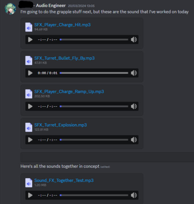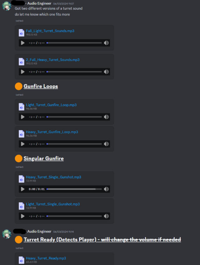 Unfortunately, I was unable to do any sound implementation. Thanks to the events on Week 5, I was unable to do any work until the actual day of the lesson. I hadn't communicated this with Aimee or any of the team members so they were left in the dark on my status or what I was doing this entire time. Which I unfortunately couldn't go into much detail. In hindsight, telling them something would've been the best course of action. Telling them I was busy with personal reasons, it didn't need to be specific at all. This isn't indicative of a Triple-A workflow. I'm expected to inform the team leads about my status on that day, the progress of my work and communicate any grievances or events that may impede my workflow. Which is exactly what I didn't do.Despite that, on that day I entered a flow state and managed to create turret sounds that were made using sounds that I got from a recently acquired Humble Bundle pack from Ovani Sound. The gunfire sounds were made by combining a "Shotgun Omnibarrel" with a "Punchy Shot" from Hollywood Action pack. I compressed them and EQ'd it to make sure it matches the mechanical sounds from a different pack.The "Ready" sound was made using a synthesizer and making a dissonant clash between two notes a minor 2nd apart. Adding reverb to it, it sounded like it was a powerful turret that reflected the gunfire sounds. I also added a touch of mechanical movement to give the impression that the turret literally "clicked on" as it saw the player.The "Riser" sound was made using a SoundQ riser and combining it with a chain locking sound. I also played around with adding an anime-esque "whistle" noise at the end of the riser just before the gunfire starts, just like how an attack is done in a shounen anime. However, it just didn't fit with the style of the game and was scrapped.