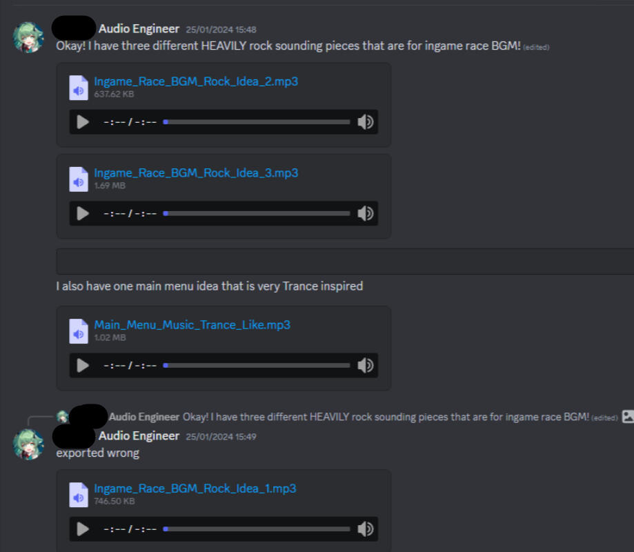By the time the third week rolled around, I had already posted my tracks to the Discord and was waiting for everyone to send in their tracks for the deadline that was set on 29/01/24. We were still waiting on Jerrell to send his tracks in. We were hoping for a few since we hadn’t heard from him in a while. However, Jerrell only sent in one which is definitely better than nothing. But call it a hunch, but the track he posted didn’t sound like he worked on it very long. Either way, Aimee sorted all the pieces into a Google Drive and made a Google Form for the Designers to fill out and judge the songs based on their sound. It was very entertaining that my experimental acoustic guitar draft managed to enter the pool, but I wasn’t expecting it to get any results either way.