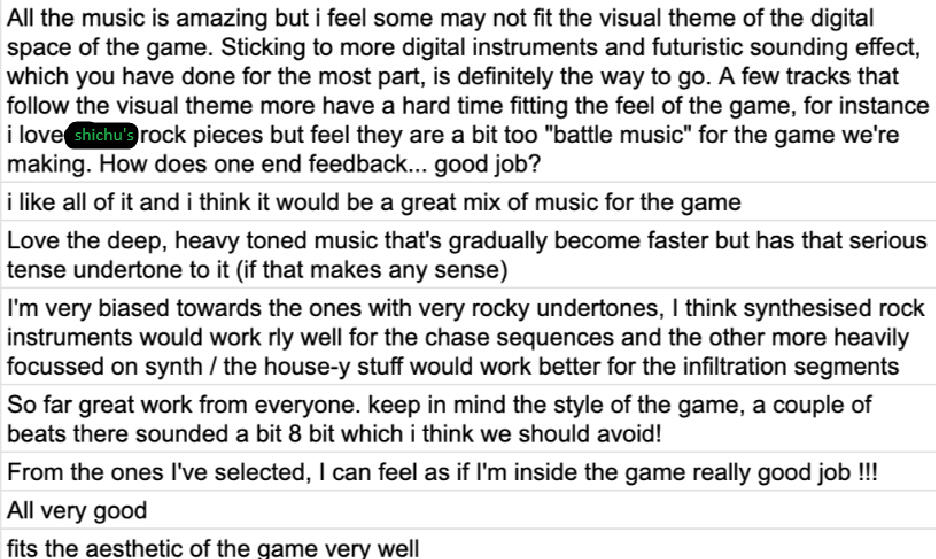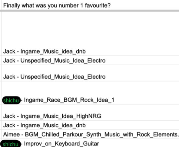 The other pieces that Jack and Aimee made were very well made, and fit the vibes of the game really well. The only piece I was concerned about was Jerrell since it took him half a week to create one draft. In hindsight, I should’ve reached out to Jerrell to ask if he needed any help and I should’ve done so a lot earlier rather than waiting for the deadline to pass by. Since I had already finished my drafts, I had time to spare to help Jerrell.I wasn’t able to attend the meeting on this day due to train strikes, but it was explained to me that Aimee spoke about her plans of setting up tasks and organising the audio asset list for us. Since it would be nice to crack on with the sound effects early.It was also within this week where we received the results of our music back, and to my surprise a lot of my tracks weren’t even picked once. I was even more surprised that the experimental acoustic guitar draft got a vote when some others didn’t. Despite that, we figured out the sort of style that the designers wanted for the game, something very synthy.