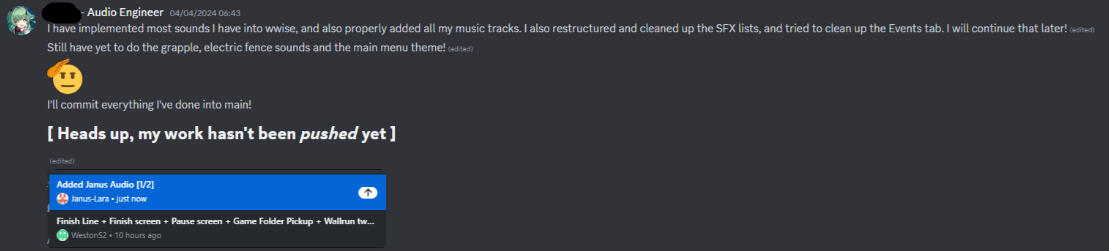 Our first week started on Wednesday where all the teams were split into small groups, with the main bulk of the work of this day being done by the designers to collaborate on possible game ideas. I helped Ollie design his bug collecting game heavily inspired by Animal Crossing & Pokémon where you catch different bugs from across different regions and areas. With room for storytelling in ruins and challenges with various different bugs that spawn at certain times, rarities and so on so forth. I helped plan out little ideas that might help.At the end of it all, Ollie’s idea wasn’t picked and Sakrita’s idea of a parkour racing game with singleplayer & multiplayer aspects was chosen. I thoroughly liked everyone else’s ideas, but I was really hoping Ollie was picked because our team was very good at making a soft and calming atmosphere in Exteriors. I thought that with our past project being relatively successful, we could pull off the vibe again and put that into this bug collecting game. Creating a nice chill game that would be quite possible for all of us to do in a Triple A setting. However, in hindsight it probably was a good idea since Ollie’s idea is relatively simple and is pretty hard to scale to a Triple-A standard.The main issues I immediately saw with Sakrita’s idea was that it was very ambitious for an inexperienced team, with a team of 4 or 5 programmers to create a movement based racing game. From Exteriors, I feared that the fundamentals of the game - the movement system - would fall short and not be up to par with others in the industry. Then there was also the split between Multiplayer and Singleplayer, let alone the thought of running servers for Multiplayer in general and all the server-side VS client-side issues we would face with all the abilities we had in the game.Audio wise, I believed that this would be relatively simple as there was only so much you can do to add sound to movement, and adding unique character to the powerups that Sakrita mentioned would be the fun part of the project’s sound design. I also already had come up with ideas that we could do for music, being heavily inspired by Payday 2 and The Finals.On the same day, I spent my time writing and experimenting with making a main menu track in inspiration of The Finals. The bass is very trance-like with a very EDM inspired melody and I wanted to replicate that feel. However, I am not very good with synths so I ended up with a track that sounded simply Trance.The idea in my head was that the game was like a The Finals-esque show with a Fall Guys Wipeout course that the players needed to cross to reach to the other side. It seemed very ambitious with the skill level of our other disciplines. I have no doubt in the audio teams’ abilities as Jack is a skilled synth wizard, Aimee is a great orchestral battle musician and Jerrell has all of us to learn off of.There was one part of Triple-A development that had me concerned. That was the Audio Lead position. I was heavily considering it, but I wasn’t sure if I’d be a great fit judging by my track record of not being too active in the community chats and in person. When I was told that we could run for it, I wasn’t too sure I’d even be considered at all since Aimee essentially led Exteriors’ audio design last time. But regardless, I believed in my own abilities as a solid candidate because I am a person who studied A-Level & GCSE Music, and was somebody with a good grasp of sound design and songwriting. I also played a lot of The Finals and Payday 2 which were the main inspirations of the project, with the others not necessarily playing those types of games. I gave my case to the team, but Aimee eventually was voted the role! Which was not wholly surprising given how great she is as a leader.The team decided to start using Jira and Confluence instead of Trello. Since those tools are used by a lot of game developers in the industry. We were also considering switching to Slack instead of Discord for a similar reason, however the consensus seemed to be leaning towards Discord. What we were doing for the first time in the project was actually implementing WWise Middleware into Unity which was something that we were all not accustomed to yet. And we were still questioning if WWise’s version control issues that we were warned about during Exteriors would persist to now. Either way, we decided to continue with it and use Github as our version control of choice.