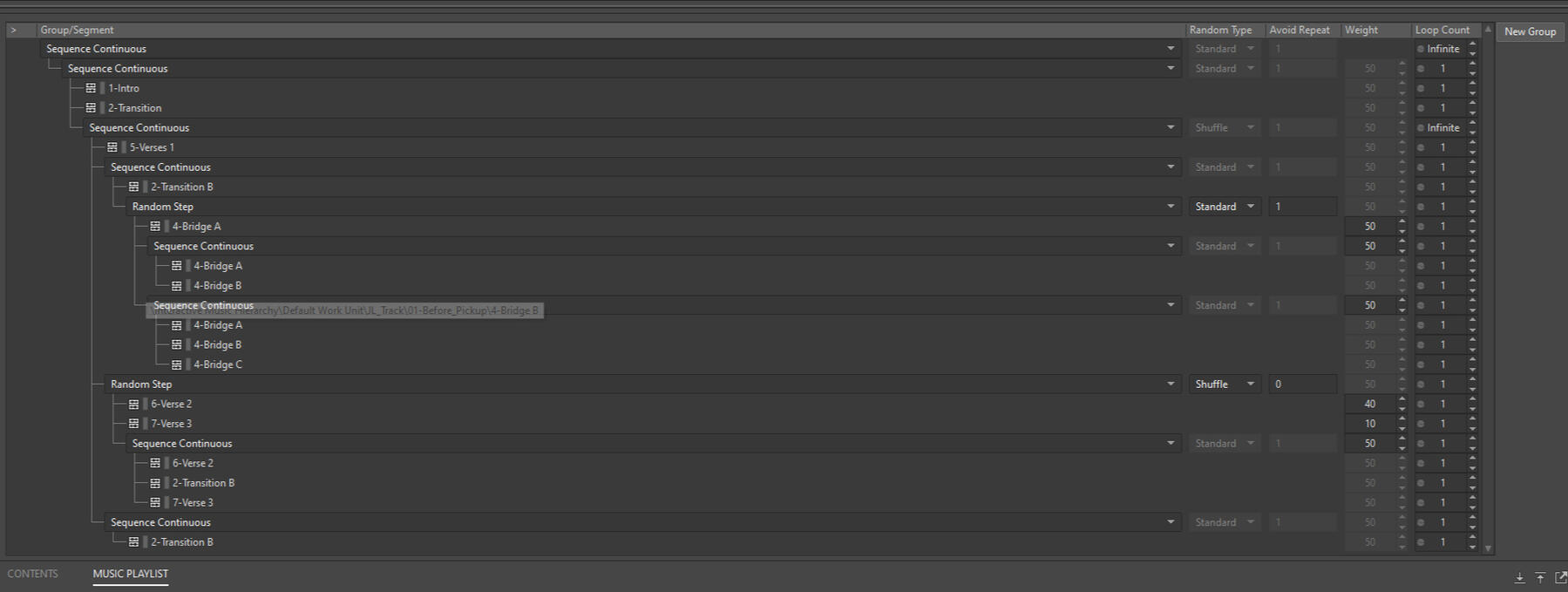 It was also here where I implemented my music. I had already bounced all of the stems and individual parts of the song. But I had no idea how to structure the song to randomise in the right way I wanted.With the help of Jack, I was able to figure out where to find the Music Mixer Hierarchy and edit the play order of all my song parts. My plans for my track were way different than the others. I essentially had two songs with a complicated randomisation order. For example, it could play "Bridge A + Bridge B" or play "Bridge A" then move into either "Verse 2 + Verse 3" or "Verse 2 + Transition + Verse 3". Additionally, each verse music segment also has a random step track where it would either play an empty sub-track or the melody track.With all of that, this song - both in rock form and synth form - has multiple different combinations of how its played. Meaning that every time it plays ingame, the structure is never the same and can potentially keep the player engaged further in game.