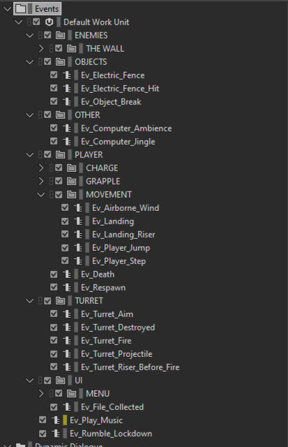 Following from Week 9, I was still extremely busy with my personal work that I couldn't do too much. So I spent an entire night just working on implementing all the sounds into the WWise project.It was a simple as downloading and converting my MP3 sounds into WAVs and dragging them into the Sound Effects Audio Work Unit. However, I didn't like how everything was organised so I added folders to better manage all the sound effects and events in the game. I am incredibly thankful that I chose to follow the naming convention at the very start of the project's development. It meant that I could simply implement the audio without worrying about keeping to the naming conventions. This is especially prudent in the music creation where I had to remember the tempo, time signature and the length of bars that the individual parts took up.This is a great example of a Triple-A workflow working out in my favour, as parity between individual member workflows such as naming conventions allows members to work on each other's files without worry. They don't need to decipher anything and chase anyone up, since they can simply learn everything about that file from the just the name alone.