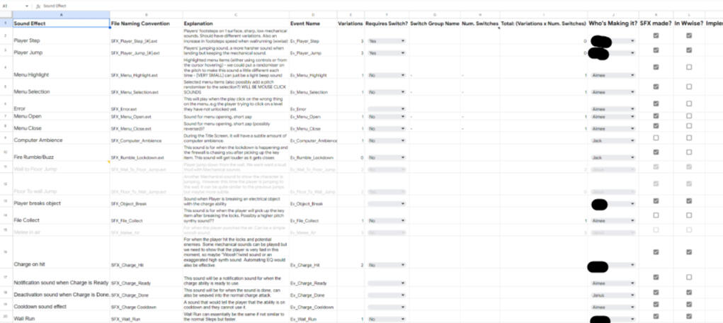 In the final week, I finished off all my tasks and ticked off everything that I've done. That includes all the grapple sounds, electrical fence sounds and barrier breaking sounds.What was interesting to make was the grapple sounds which I'm still unsure of. I chose to use a bicycle chain moving as the reel in, but I believe that it just sounded too slow. The firing sound of the grappling hook is also very similar to a turret, so I do worry that the player might mistake the grappling hook as a turret if they didn't know any better. If the week 5 situation hadn't happened, I would've made a faster bicycle chain sound by myself and change the grapple hook fire sound to a more "launcher"-like sound. Originally I was very inspired by the ODM gear from Attack On Titan, but it was hard to replicate the sound without directly copying it. If I had more time, I would've tried to find more way to create a grapple sound effect that was not only unique, but also interesting for the player.Other sounds were made by using sounds related to the name.